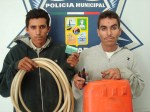 En la misma colonia El Zacatal pero a las 00:45 horas el convoy policial logró la detención de Edgar Valenzuela Chávez, de 29 años, y Norberto Solano Bustos, de 21 años, originarios de Comondú, BCS, y Estado de México, respectivamente, como presuntos responsables de hurtar gasolina a un vehículo estacionado en las calles de la citada colonia.