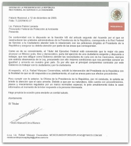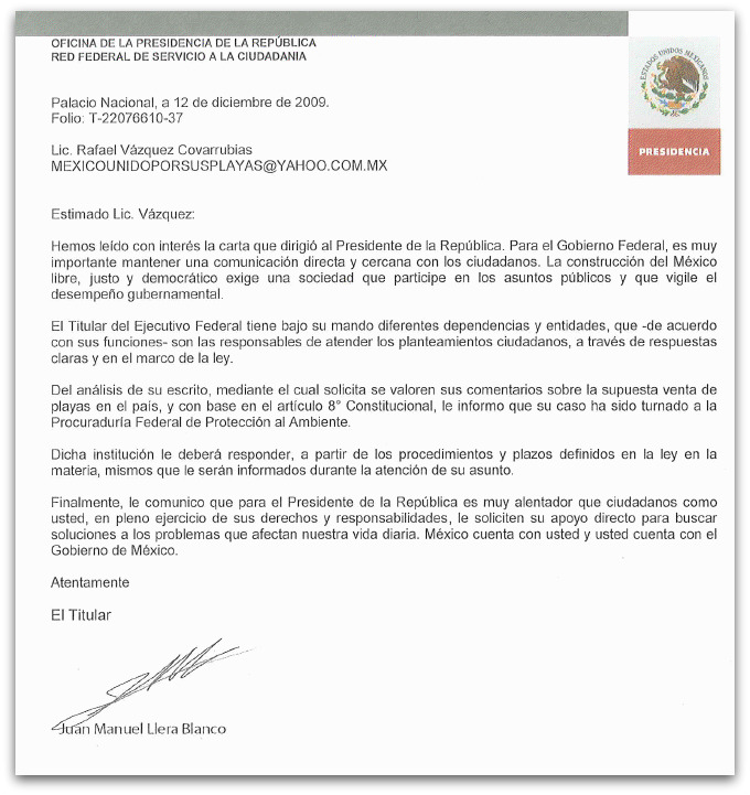 «En esas consideraciones le han instruido desde el Palacio Nacional al Procurador Federal de Proteccion al Ambiente el dia 12 de Diciembre del año 2009 , se tomen las acciones inmediatas para que se erradiquen dichos problemas sociales que afectan a los ciudadanos que radican en la Baja California , para erradicar dicho mal que les esta afectando, así como para que se le den los resultados a la sociedad que exige el respeto a