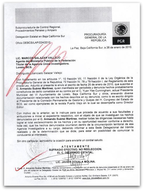 Por los delitos de privación ilegal de la libertad, desaparición forzada, abuso de autoridad, coalición de servidores públicos, intimidación, amenazas, robo, portación ilegal de arma de fuego e intento de homicidio, fue denunciado ante la Procuraduría General de la República en La Paz, el presidente municipal de Loreto Yuan Yee Cunningham y cinco servidores públicos, por el periodista Armando Suárez Martínez, director de la revista Puerto Viejo.