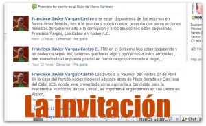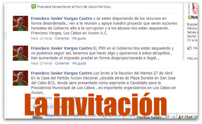 Sin embargo, Vargas Castro a través de un mensaje vía FACEBOOK, desde anoche invitaba a esta reunión en la nueva casa del PAN en San José del Cabo, donde sería presentado como «aspirante Precidencia Municcipal de Los Cabos» (sic), lo que se contrapone con la vía institucional que utiliza el blanquiazul para presentar a sus precandidatos que es a través de una convención.