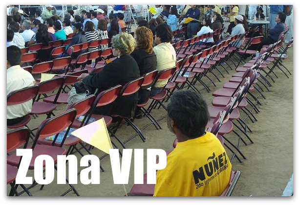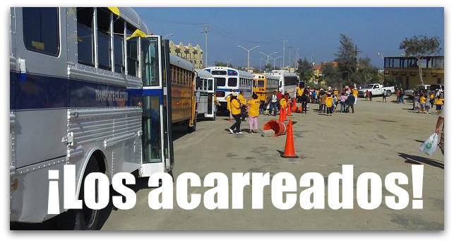 Todavía a las siete de la noche se observaba desesperado al director de atención ciudadana del ayuntamiento cabeño, Salvador Ruelas Pelayo, apurando a los acarreados para que ingresaran lo antes posible al estadio de beisbol y para que se hiciera más expedita la repartición de camisetas, matracas y «manitas aplaudidoras».