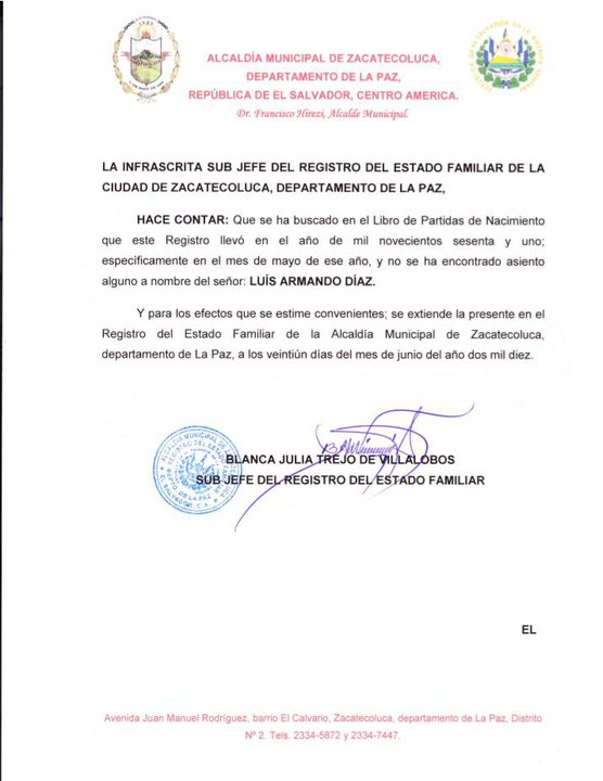 La Paz, B.C.S.- Ya esta circulando una certificación del Registro del Estado Familiar (registro civil) de la municipalidad de Zacatecoluca, república centroamericana de El Salvador, donde se afirma que Luis Armando Díaz no es originario de ese lugar, según la búsqueda que se hizo en los archivos correspondientes al año de 1961 «específicamente del mes de mayo».