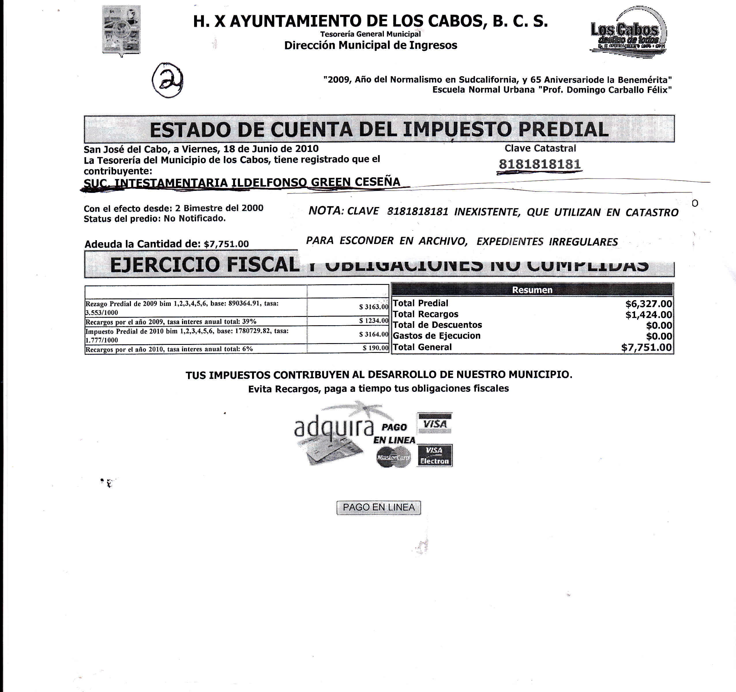 Copias de Documentos oficiales emanados de Catastro-Registro Público de la Propiedad del Mpio de Los Cabos ,hacen ver que la grandilocuente denuncia publicada en primera plana por el Gobernador Agundez el 25 de Mayo pasado en diarios locales, acusando a directivos (pidió su cabeza) del ayuntamiento de Los Cabos de orquestar una evasión de impuestos cercana a los 300 millones de pesos favoreciendo la empresa Royal XP , es simple y llanamente un ajuste de cuentas derivado del agandalle que el ex Gobernador Cota propino su predecesor, inscribiendo primero en el Registro Público de la Propiedad la compra venta mediante la cual Salvador Avilés Green un nuevo albacea de la sucesión de I.Green vendió un predio a Royal XP, pese a que previamente de acuerdo a fechas de las escrituras consultadas, un albacea anterior de nombre Iván Palacios habría vendido el mismo terreno a Inmobiliaria Moss.