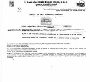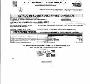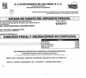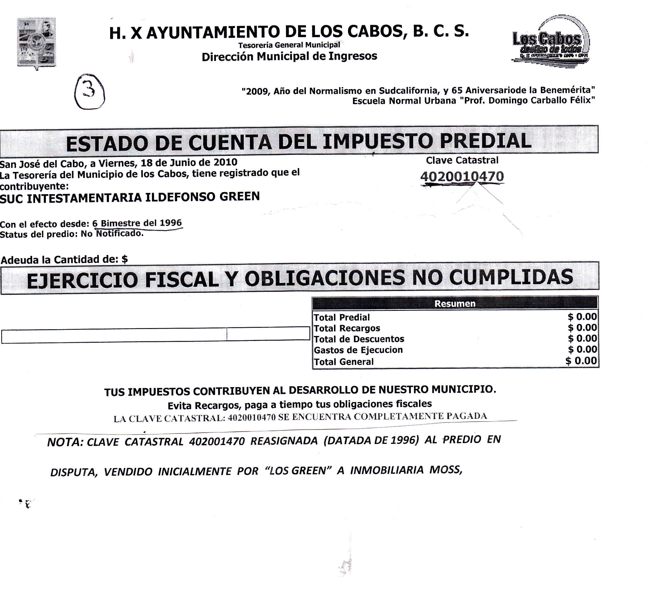 1. el 28 de abril del 2009 mediante escritura 125,396 vol.3117 el notario público 3 Xavier Ibáñez de Tijuana BC protocolizo la compra venta del predio de 115 Has, donde la sucesión de I. Green representado por Iván Palacios actúa como parte vendedora, siendo la compradora, Constructora y Proyección Comercial S.A de CV Y Servicios Inmobiliarios Moss (para fines de redacción e identificación se les denomina a esta parte solo como Inmobiliaria Moss), asignándosele al predio la clave catastral 402-001-0470, fijándose el monto de la operación en 300 millones de pesos. Cabe mencionar que búsqueda en archivos del Catastro Los Cabos arroja que dicha clave (anexo 3) data de 1996, dándola de alta irregularmente el entonces director Daniel Fisher, a partir de ahí, un permanente defraudador fiscal de la Hacienda Pública Municipal, también conocido compañero de pesca en torneos del singular Òscar Dacarett.