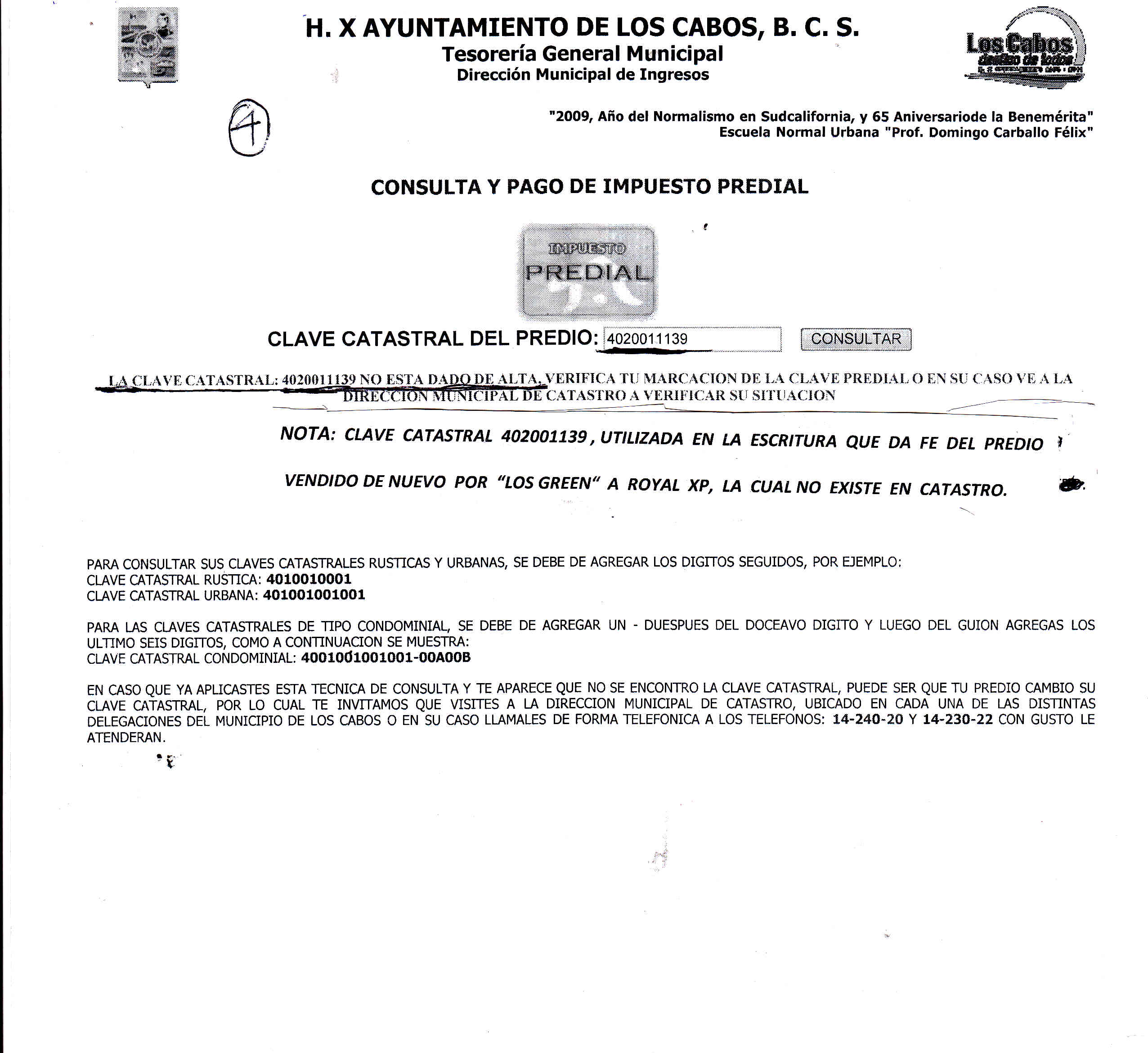 2. Dos meses después, el 1 de junio del 2009 mediante escritura pública 29,845 Vol. 416 tirada ante la fe del notario 28 de Hermosillo Son., Salvador Corral, el nuevo albacea de “Los Green , Manuel S. Avilés vende el mismo predio pero con otra clave catastral , la 402-001-1139, a Royal XP en 13, 627 millones de pesos, equivalente a ¡45! veces más de lo supuestamente pagado por Moss, donde documentos oficiales consultados indican que esa clave fue dada de alta en abril del año dos mil (precisamente cuando Agundez era alcalde) manifestándose con un valor de 1 millón doscientos dos mil pesos a favor de la sucesión de I. Green . actualmente esa clave (anexo 4) ya no existe en el sistema.