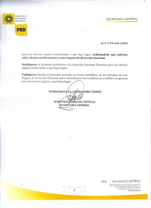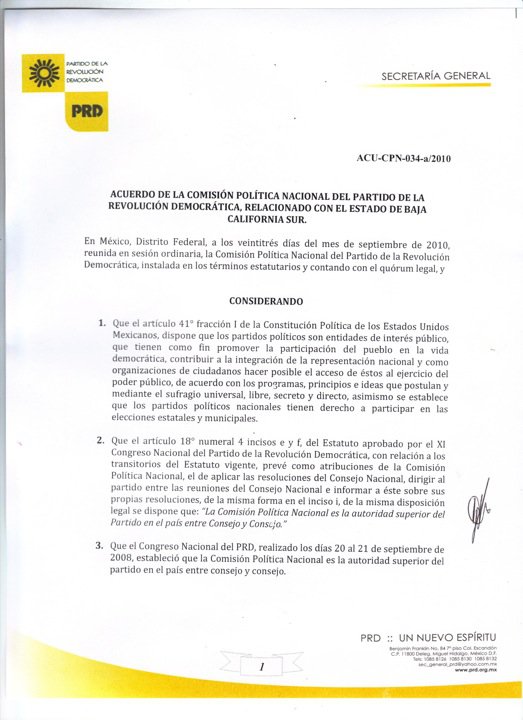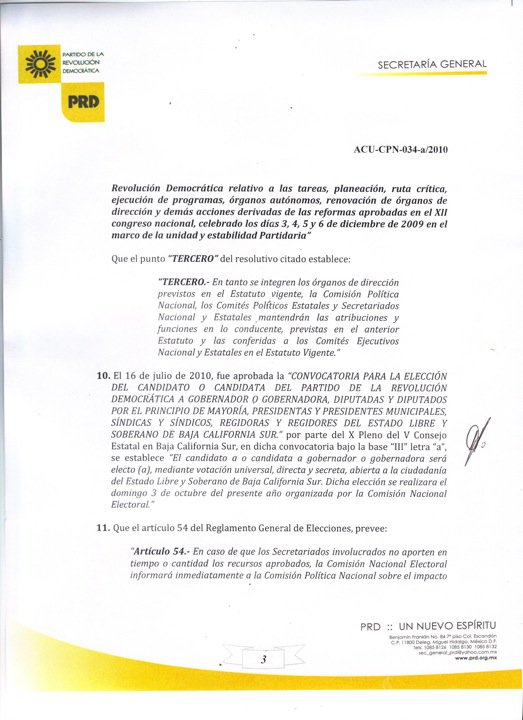10. El 16 de julio de 2010, fue aprobada la «CONVOCATORIA PARA LA ELECCIÓN DEL CANDIDATO O CANDIDATA DEL PARTIDO DE LA REVOLUCIÓN DEMOCRÁTICA A GOBERNADOR O GOBERNADORA, DIPUTADAS Y DIPUTADOS POR EL PRINCIPIO DE MAYORÍA, PRESIDENTAS Y PRESIDENTES MUNICIPALES, SÍNDICAS Y SÍNDICOS, REGIDORAS Y REGIDORES DEL ESTADO LIBRE Y SOBERANO DE BAJA CALIFORNIA SUR» por parte del X Pleno del V Consejo Estatal en Baja California Sur, en dicha convocatoria bajo la base «III» letra «a», se establece… «El candidato a o candidata a gobernador o gobernadora será electo (a), mediante votación universal, directa y secreta, abierta a la ciudadanía del eEstado Libre y Soberano de Baja California Sur. Dicha elección se realizará el domingo 3 de octubre del presente año organizada por la Comisión Nacional Electoral».