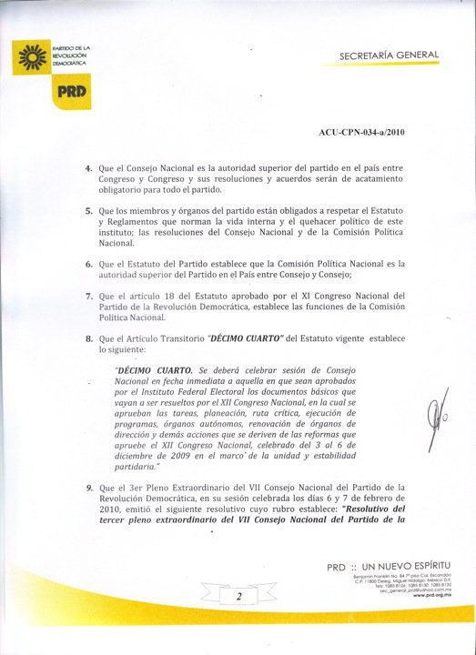 2. Que el artículo 18° numeral 4 incisos e y f, del Estatuto aprobado por el XI Congreso Nacional del Partido de la Revolución Democrática, con relación a los transitorios del Estatuto vigente, prevé como Atribuciones de la Comisión Política Nacional, el aplicar las resoluciones del Consejo Nacional e informar éste sobre sus propias resoluciones, de la misma forma en el inciso i,de la misma disposición legal se dispone que: «La Comisión Política Nacional es la autoridad superior del Partido en el país entre Consejo y Consejo».
