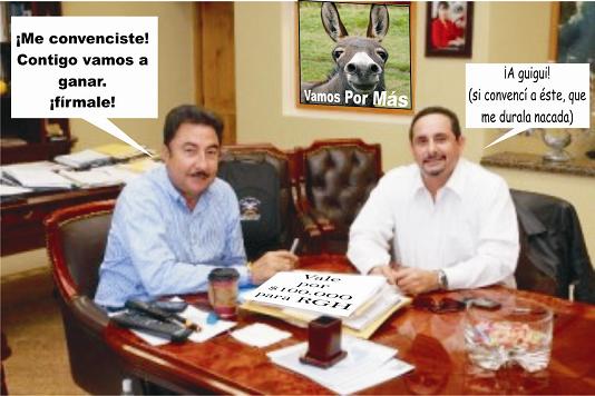 La mano (o la nariz) del gobernador del estado Narciso Agúndez Montaño está metida hasta el tope con los alegatos de Alonso Germán Castro, luego de que, por estatutos, el PAN le revocó su derecho de contender por la gubernatura del estado al registrar su alianza con el MRPS. El cañonazo de billetes ronda el millón de pesos… dicen los priistas que Estela (con H) Ponce va a la cabeza de las preferencias electorales con 8 puntos sobre K-11 y abajo le sigue el pipi Ibarra y al fondo con 2 puntos, el poderoso Ricardo Gerardo Higuera… Manuel López, regidor del PT sumó su talento a la campaña de RGH. Por lo pronto éste último ya lo convenció para que le mandara hacer 500 calcomanías con cargo a su bolsillo; Cayó facilito… que ya le llenaron el buche de piedritas a las autoridades federales y que en breve, se tendrán noticias de las acciones judiciales que empezarán a ejecutarse entre diciembre y enero próximos, lo que ha generado desórdenes estomacales entre algunos funcionarios y candidatos.