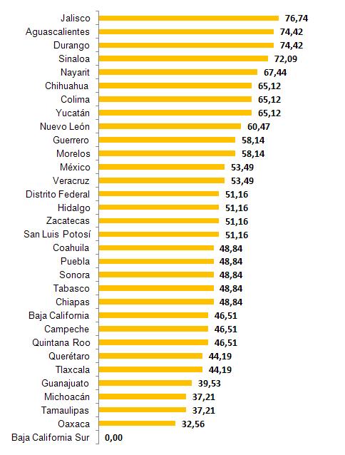 Este año 2010, por citar algunos casos solamente, a reserva de que usted analice la gráfica correspondiente: Jalisco 76.74, primer lugar, Aguascalientes 74.42, Durango también 74.42, Sinaloa 72.09, Yucatán 65.12, DF 53.49, Coahuila 48.84, …y BCS al último con 00.