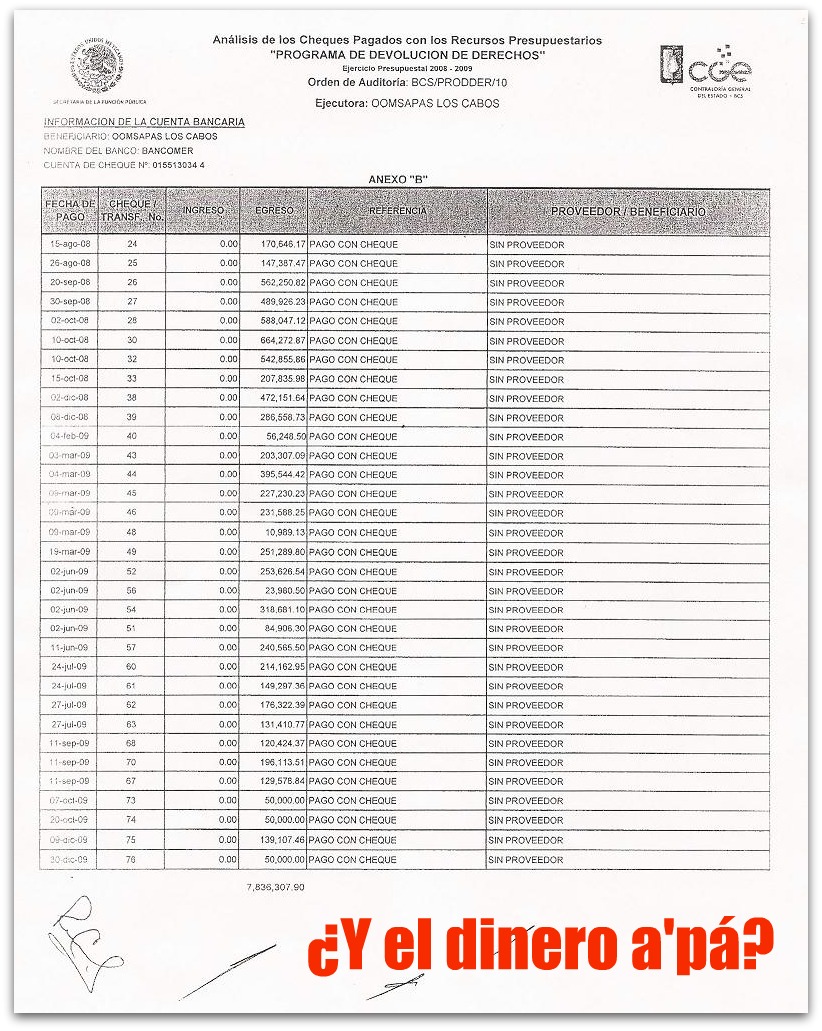 Otro de las irregularidades que saltan a la vista, es el pago de una larga lista de cheques con el concepto SIN PROVEEDOR. O sea, dinero que salió de las castigadas arcas del agua potable que no se sabe a dónde fue a parar, lo que es motivo suficiente para encarcelar a cualquier gerente de cualquier empresa honesta.