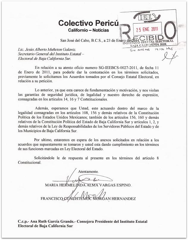 La Paz, B.C.S.- Luego de que el Instituto Estatal Electoral emplazara el 11 de enero a través de un «extraño» oficio a Colectivo Pericú a entregar archivos e información de nuestra propiedad, ayer mismo nos presentamos para dar respuesta por escrito a ese ofensivo requerimiento.