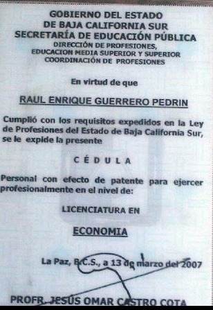 San José del Cabo, B.C.S.-  Colectivo Pericú publicó información de la SEP, donde se afirma que no existe ninguna cédula profesional expedida a favor del rector (director) del Instituto Tecnológico de Los Cabos (ITES), Raúl Enrique Guerrero Pedrín, lo que por reglamento sería motivo para separarlo inmediatamente del cargo.