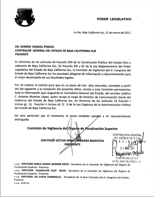La Comisión de Vigiliancia del Organo de Fiscalización Superior del Poder Legislativo de Baja California Sur, solicitó a la Contraloría General del Estado, el expediente completo de las irregularidades cometidas por el aún vocero de gobierno, Antonio Alcántar López.