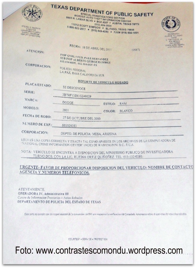 Este lunes, de acuerdo a documento que mostro el responsable de la PFP en la región, Manuel Beltrán Sánchez, se confirmó que la unidad Pick Up, color blanco, modelo 2001, línea RAM 1500, tiene reporte de robo en el Estado de Texas del vecino país del Norte, con fecha 27 de octubre del año 2000.