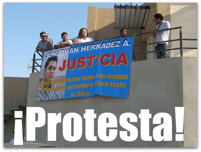 En un edificio cercano, el padre de Jonathan, don Daniel Hernández Ascencio acompañado de sus familiares, colocó una manta con la esfigie de su vástago que fue asesinado la madrugada del 4 de marzo de 2010 en el bar «Las Micheladas».