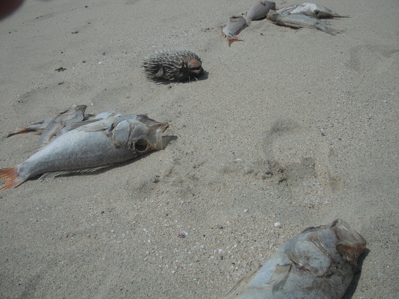 Los Cabos, B.C.S.- Desde el viernes anterior miles de peces han aparecido muertos a la orilla del mar en un largo tramo que va desde la zona conocida como Las Vinoramas hasta playa Zacatitos en Cabo del Este y a la fecha, se desconoce lo que ha causado esta anomalía.