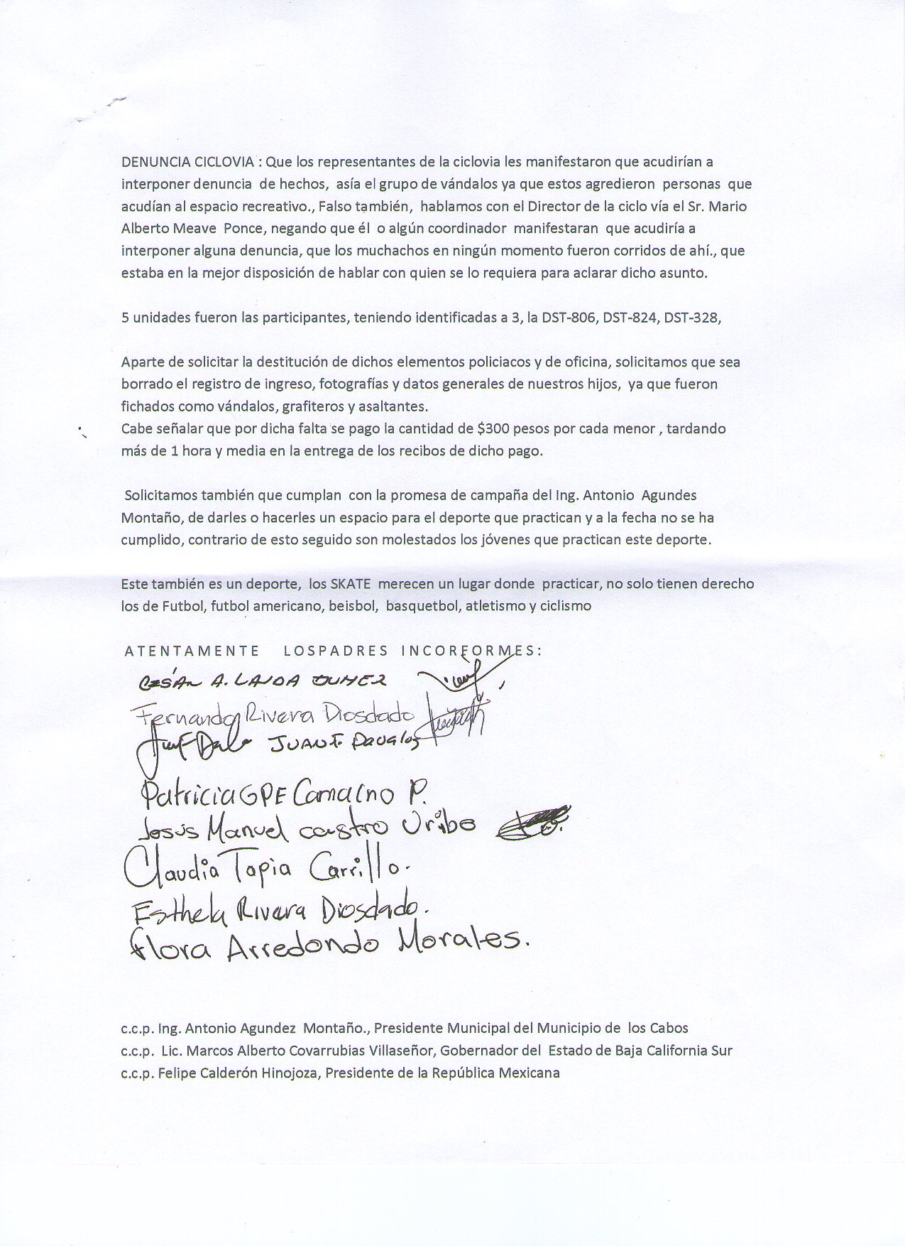 Y la gente parece ya no tener temor en denunciar los abusos policiacos. En la redacción de Colectivo Pericú acabamos de recibir otra más, de un joven que al salir la madrugada del domingo anterior del tugurio conocido como LAS VARITAS en el centro de este puerto, fue abordado por un grupo de municipales.