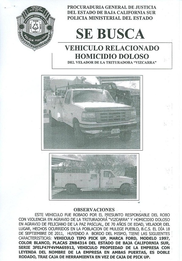 El Abogado del Estado señaló que un dato importante en la investigaciones es el hecho que el probable responsable huyó del lugar de los hechos a bordo de un vehiculo tipo pick – up marca Ford modelo 1997, color blanco, con placas de circulación ZNB4314 del Estado de Baja California Sur, con la leyenda “Trituradora Vizcarra” en ambas puertas, con caja metálica de herramientas en ambos lados, por lo que solicita la colaboración de la ciudadanía a efecto de que en caso de observar dicho vehiculo abandonado en brechas, caminos vecinales, circulando en carreteras o calles de Baja California Sur reportarlo de inmediato a los teléfonos 01-800-71-07-293 o 01-612-12- 2-13-99 de la Policía Ministerial del Estado en La Paz, B.C.S. o al 066 de Seguridad Pública.