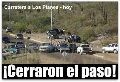 San Juan de Los Planes (Municipio de La Paz), B.C.S.- Invasores de tierras mantienen bloqueada la carretera que va de de Agua Amarga a Ensenada de Muertos, delegación de San Juan de Los Planes, a la altura del ejido de Agua Amarga. El bloqueo, realizado con una decena de camionetas pick-up, afecta gravemente el tránsito en la zona, y el libre paso de personas. Se informa que han cortado la electricidad de varias zonas aledañas a Los Planes.