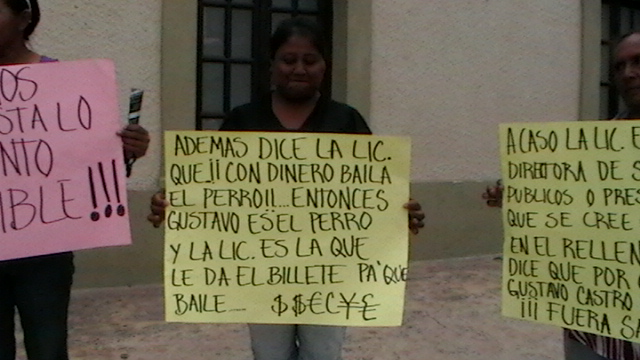Las humildes familias de pepenadores quieren que el alcalde Antonio Agúndez Montaño retire a esta dama del lugar, pues no toleran su trato prepotente, altanero, grosero y humillante. Desean seguir trabajando como siempre lo han hecho, con tranquilidad y generando un ingreso estable para su hogar.