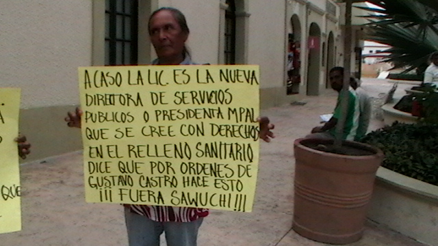 Los recicladores de basura independientes, que recogen materiales reutilizables en el relleno sanitario, acudieron a manifestar al presidente municipal Antonio Agúndez Montaño que ya no aguantan la actitud prepotente de la «concesionaria» del confinamiento de basura de nombre Claudia María Gómez Saguchi quien se ha transformado en la única compradora de los excedentes reutilizables que ellos recolectan.
