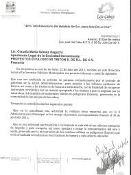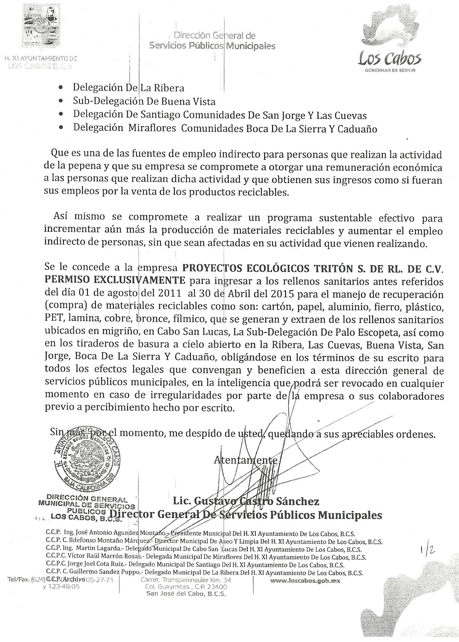 3.- Por último, te enviamos el documento donde La DIRECCION GENERAL DE SERVICIOS PUBLICOS le ha otorgado EL PERMISO EXCLUSIVO A PROYECTOS ECOLOGICOS TRITON como la unica empresa que ingrese a los rellenos municipales asi como la solicitud del Ing. CARLOS MARTINEZ para ingresar a los rellenos sanitarios municipales ubicados en las diferentes localidades de Los Cabos, misma que le fue negada y que es de ahi donde dependen las familias que hoy se manifestaron ante la autoridad municipal dada la decision imparcial de las autoridades de desplazar a otras empresas existentes.