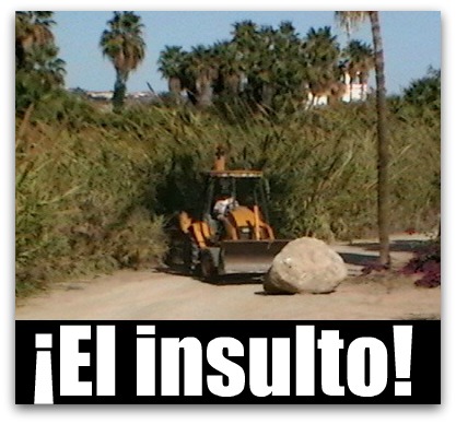 Poblado La Playa (San José del Cabo), B.C.S.- A las dos de la tarde nuevamente ocurrió otro enfrentamiento entre el consorcio Puerto Los Cabos, propiedad del «empresario» Eduardo Sánchez Navarro y pobladores, que se encontraron con la novedad de que el camino vecinal que conduce a 15 huertas fue bloqueado con todo lujo de prepotencia el día de hoy.