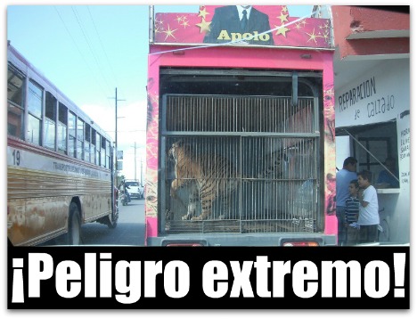 18. Aqui en la Paz en la calle alta tension y sonora se les poncho una llanta y duraron mucho tiempo en una llantera cambiando la llanta con el tigre enjaulado…..Creo que un animal de esa magnitud y ese peligro no es para pasearlo y lucirlo por las calles, ya que representa un gran peligro para todos en general……..Y si bien no ha pasado nada, no hay que esperar a que algo suceda las autoridades deberian negarles el permiso de hacer esos actos……..