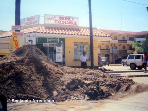 En ese huracán Linda de 1997, de las pocas calles pavimentadas en San José, una fue siempre la Valerio González. Y luego del huracán la calle desaparecía ya que se cubría totalmente de arena. En esta toma alcanzamos a ver a la izquierda el Conalep.