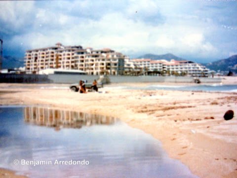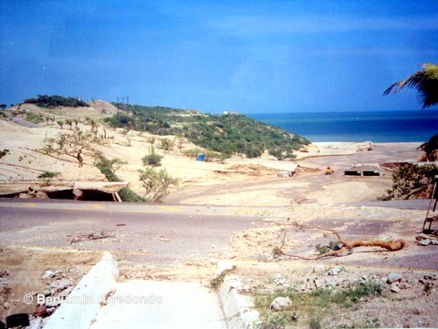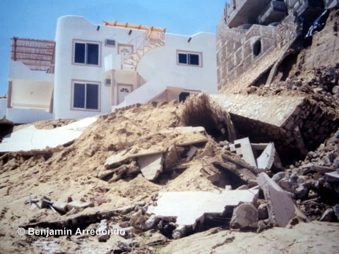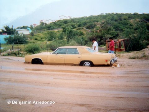 Del paso de Henriette y del de Ismael no tengo fotos. Para mi no era la primera vez que experimentaba un huracán, ya había vivido dos muy leves en Cancún, pero estos que viví en Los Cabos sí que fueron fuertes. Y sucedía algo que se antoja increíble ver en una zona de desierto: la aparición de ríos. Lo que vemos es el desplome de la rampa de acceso a los condominos Mar y Sol por el rumbo de La Joya en San José del Cabo en 1997.