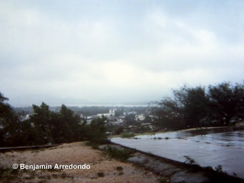 Esta fue una toma bastante arriesgada que hice en el huracán de 1999, era el mediodía, el huracán había ya bajado de intensidad pero aun había ráfagas, me fui al rumbo de las antenas para ver el centro. Notarás como destaca increíble, el arroyo de San José… en eso estaba cuando una ráfaga me arrastró, por suerte me alcancé a detener, de lo contrario hubiera salido volando.