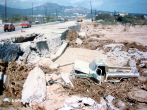 Al día siguiente, en el recuento de los daños encontramos cosas sorprendentes, como aquí en el Arroyo Seco, justo a la entrada de Cabo San Lucas, allí donde ahora están las canchas de fútbol. El arroyo arrastró todo lo que había por su paso, lanchas, autos, árboles…