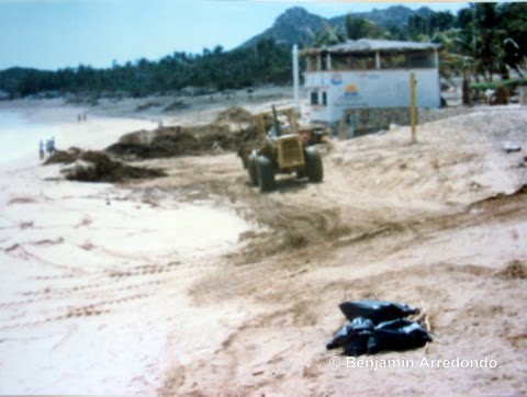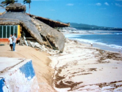 Imagina la fuerza del oleaje que se sintió durante todo el huracán de 1999 al grado que el nivel de la playa bajó dos metros o más… aquí vemos que The Office desapareció y la palapa de Mango Deck colapsó.