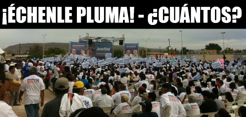 Aquí a nadie le duele ver un desafortunado evento de acarreo y campaña mediocre. Lo bueno es que la raza salió ganona con su playera, torta, su refresco y sus 200 pesos. ¿O no raza?. Si nos descuidamos hasta la mamá de Pepe alcanzó despensa. Aunque ya la metió al padrón de Oportunidades para que se aliviane. Así es que dele duro a la campaña oficial para que desquite mi Pepe. Saludos Pepe.