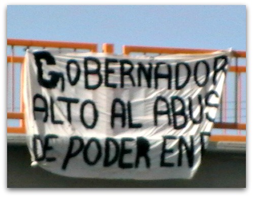 Los mensajes son de «Marcos: alto alrevanchismo político»; «Gobernador no ah la cacería de brujas» y «Gobernador alto al abuso de poder».