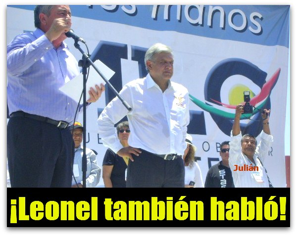 APOYO A ANDRES MANUEL, SUS PROPUESTA PARA MI, HASTA AHORA SON LOS MEJOR. REITERO APOYO A AMLO, MAS NO AL PRD. CREO QUE LA PRESENCIA DE LEONEL NO FUE BENEFICA EN ESE MITIN, LEONEL ES MUY TRAICIONERO, SE LE OLVIDA QUE EN LAS ELECCIONES PASADAS A GOBERNADOS DE BCS, AL FINAL ANDUVO APOYANDO AL TITERE DE BARROSO, YA NI FRIEGA, NO HAY VERGUENZA. NO MAS LEONELISTO EN BCS, NO MAS DE LOS COTA MONTAÑO.