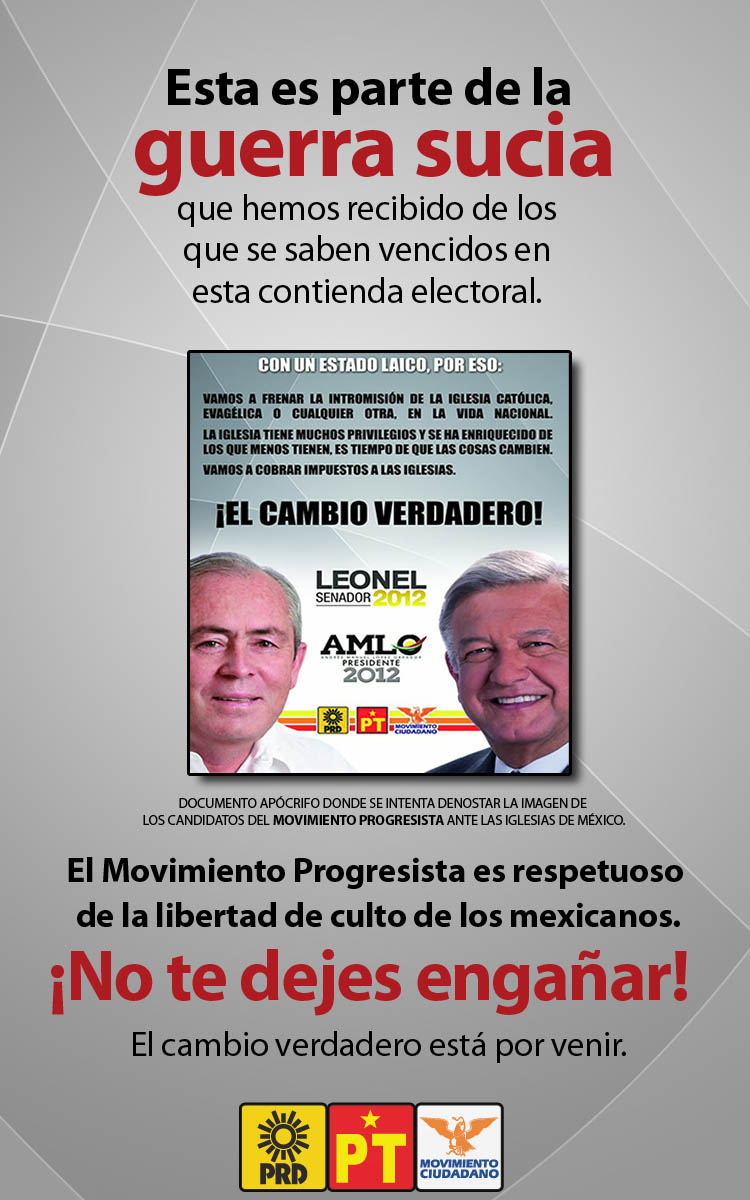 Se han detectado volantes apócrifos con las imágenes los candidatos del Movimiento Ciudadano Andrés Manuel López Obrador y Leonel Cota Montaño, presuntamente denunciando a las diversas Iglesias en México.