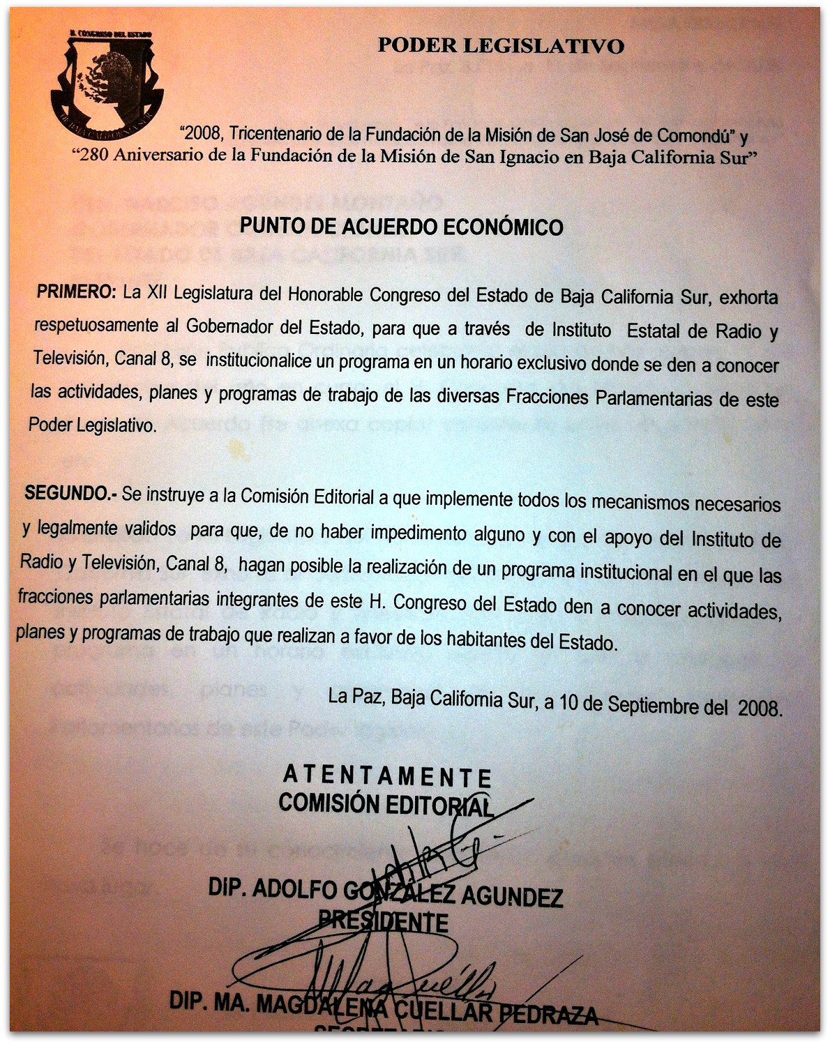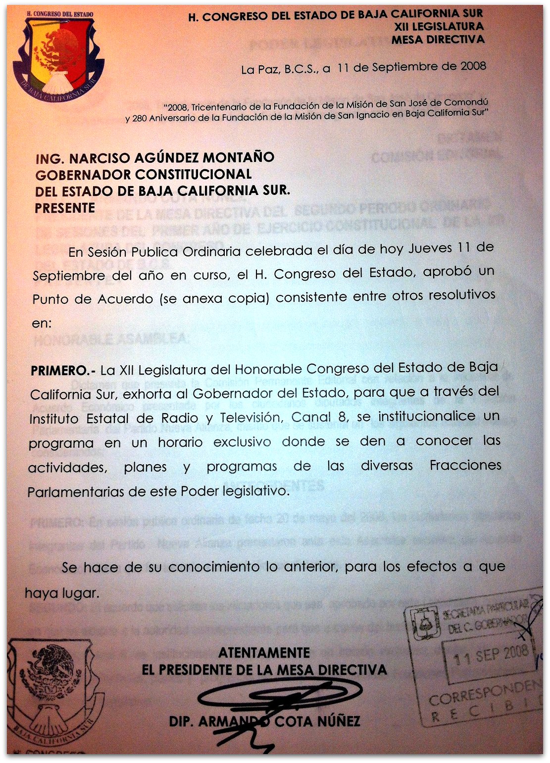 Es por ello que, anexo a los documentos del dictamen citado líneas arriba, el 18 de septiembre del 2008 el gobernador gira un memorándum a Alfonso Gavito para que, en términos de su competencia, establezca un espacio tanto en radio como en televisión para el Congreso.