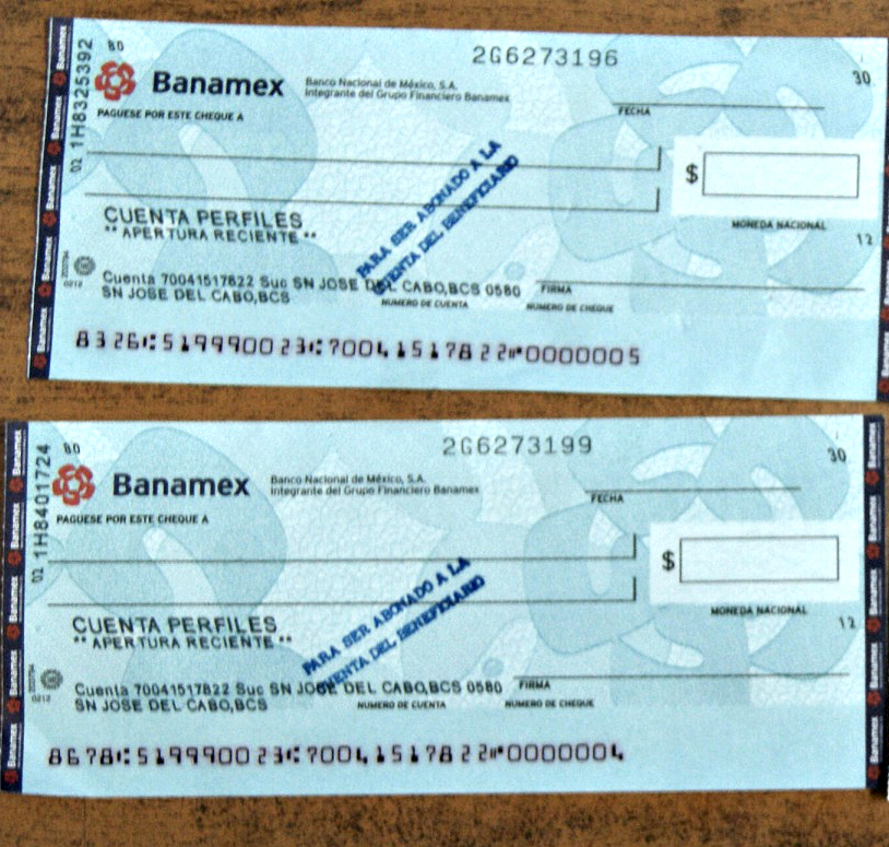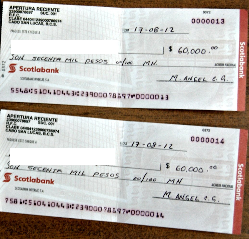 No se sabe todavía si los documentos con que pagaba son falsos, pero le encontraron dos chequeras tienen la leyenda de Banamex cuenta Perfiles No. 70041517822 y la Scotiabank No. 23900078697 (Ver fotos).