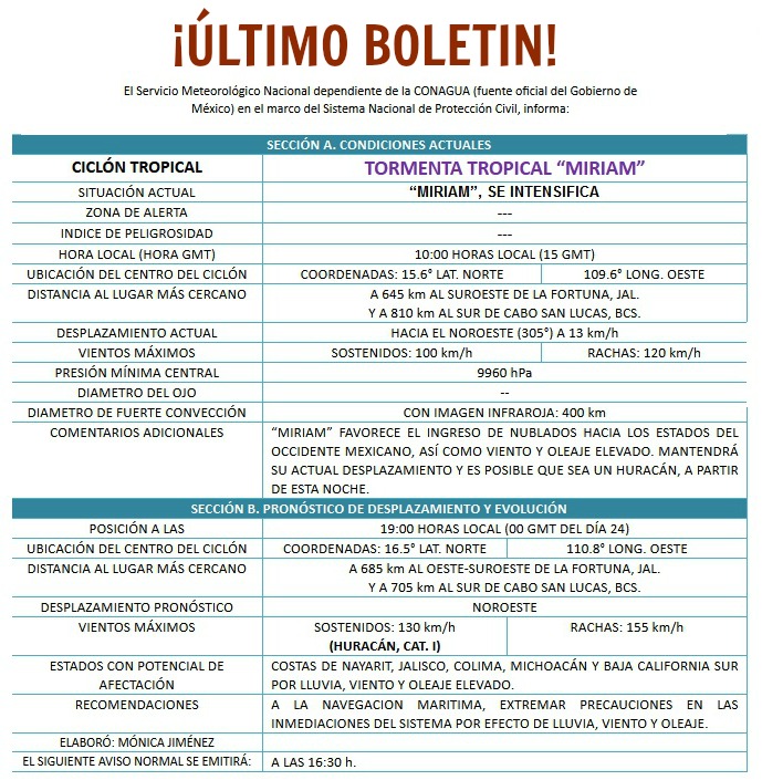 El SMN pronosticó que a las 19:00 horas, tiempo de México, Miriam se ubicará a 685 kilómetros al oeste-suroeste de la Fortuna, Jalisco, y a 705 kilómetros al sur de Cabo San Lucas, Baja California, con vientos máximos sostenidos de 130 kilómetros por hora y rachas de 155.
