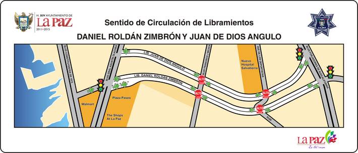 La Paz, B.C.S.- Por este conducto, la Dirección General de Seguridad Pública, Policía Preventiva y Tránsito Municipal de La Paz, informa a la ciudadanía que a partir de las primeras horas del próximo jueves 29 de Noviembre del 2012, LOS LIBRAMIENTOS DANIEL ROLDÁN ZIMBRÓN Y JUAN DE DIOS ANGULO, volverán a ser de dos sentidos, luego de varios días en que funcionaron en un solo sentido cada uno, lo que originó molestias y quejas entre la población, no obstante que este tipo de libramientos carreteros así se sugiere técnicamente que opere.