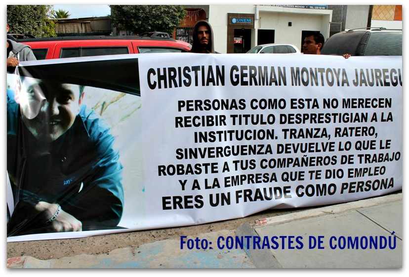 Mientras que en el interior del Teatro de los Agricultores, se llevaba a cabo la ceremonia de entrega de Cedulas y Títulos a 54 Profesionistas que concluyeron con todos los requisitos en las carreras de Ingeniería en Industrias Alimentarias, Sistemas Computacionales, Ingeniero Industrial, y de licenciados en Informática y Administración, en las afueras del inmueble, empleados de la empresa Eléctrica y Plomería de Sudcalifornia, se plantaron con lona que contenía foto y leyenda que a la letra decía: “Personas como esta no merecen recibir título, desprestigian a la Institución. Tranza, ratero, sinvergüenza devuelve lo que robaste a tus compañeros de trabajo y a la empresa que e dio empleo, Eres un Fraude como Persona”.