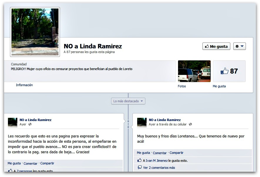 En esa red se ha creado un perfil denominado «NO A LINDA RAMÍREZ», donde se advierte: «PELIGRO!! Mujer cuyo oficio es censurar proyectos que benefician al pueblo de Loreto».