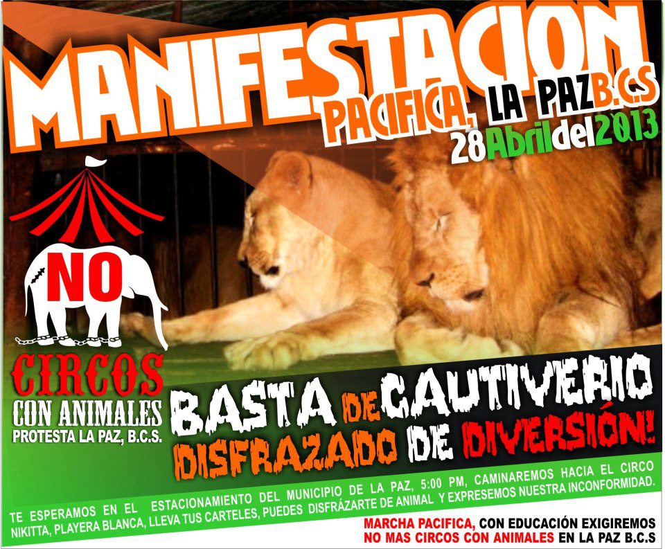 las personas tiene derecho constitucional a manifestarce, sera de forma pacifica y ellos claramente estan buscando enardecer a otras personas, para que sea gente encontra de gente mientras ellos siguen llenando sus bolsillos con su dinero y acosta de una animale que estara toda su vida encerrado, en los cabos personal del circo agredio de forma fisica y verbal a una compañera cuando nos manifestabamos, dijo ser un espectador mas, una ciudadana local con su familia cuando en realidad era gente que trabaja ahi, nosotros tenemos el video, las autoridades tubieron q ue defender a nuestra compañera porque oviamente no iva a responder puesto que la violencia animal no puede defenderce con violencia tambien, jamas ningun ciudadano subcaliforniano ha agredido a ningun defensor de los animales, que curioso seria que ahora sucediera no? yo suplico a los padres de familia que cuiden a sus hijas quienes seran seguramente las que movidas por sus emociones perfectamente bien amaestradas por los muchachos trataran de hacer locuras en contra de ciudadanos pacificos, esto no es un juego, se trata de la vida de seres vivos que son explotados, se trata de trafico de especies, se trata de encierro y maltrato que provoca en los animales algo llamado locura circence, se trata de dejar de ser un estado 3er mundista y no permitir que el turismo DEL CUAL VIVIMOS vea que aun permitimos el maltrato animal, cuando en los lugares de donde nos visitan este tipo de practicas son totalmente ilegales, saben en donde estraran sus hijos e hijas el domingo? porque mejor no enseñarles a amar y repetar la vida animal, los verdaeros artistas de un circo son los acrobatas, si no hubiera animales igual los seguirian, es tiempo de modificar sus espectaculos, no es en contra de un circo en especial, es un fenomeno MUNDIAL, los animales tienen derecho a permanecer en su habitat antes que se conviertan en un recuerdo para las sig generaciones.