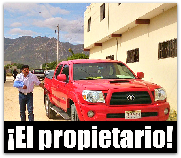 Llegó a bordo de una camioneta Toyota Tacoma de color rojo, platicó brevemente con su joven esposa que ya lo esperaba y procedió a dialogar con el presidente del Comisariado Ejidal.