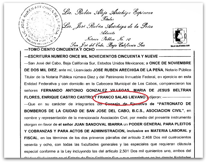 Pero en el cuerpo de bomberos no es así, pues está infiltrado como contador una persona de nombre FRANCO SALAS LIÉVANO, quien a su vez es hermano de RAÚL SALAS LIÉVANO, detenido y procesado por invasión en Cabo San Lucas en octubre de 2011 (A. P. 319/2011). Y ambos son hermanos de DAVID SALAS LIÉVANO, jefe de sicarios de César Uzcanga Amador quien fue detenido por robo con violencia (asalto a mano armada) en Cabo San Lucas en julio de 2011. (Acaba de salir de la cárcel).