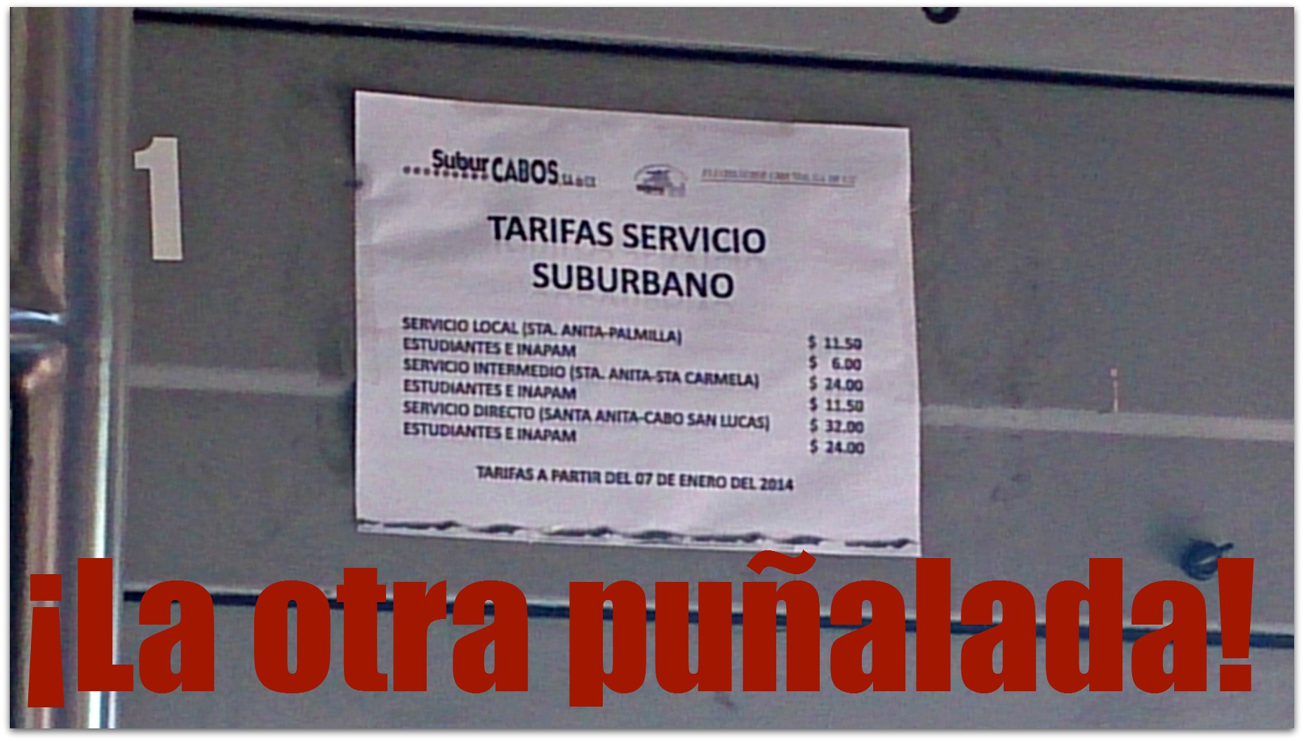 Mientras esta confusión persiste, la empresa Suburcabos desde hace una semana también elevó sus tarifas (ver foto), aunque esto se regula por la Dirección Federal del Transporte de la Secretaría de Comunicaciones y Transportes, que no ha dado explicación.
