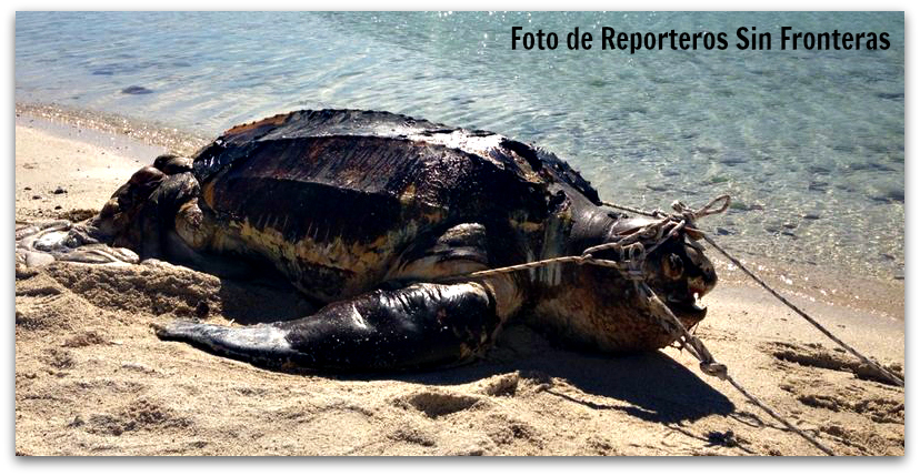La Paz, B.C.S.- Sorpresa ocurrió hoy temprano cuando fue encontrada esta tortuga LAÚD en el Puerto de Pichilingue. Las causas son investigadas por personal de PROFEPA. (Reporteros Sin Fronteras).
