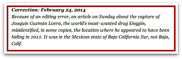 «Debido a un error de edición, en artículo del domingo sobre la captura de Joaquín Guzmán Loera, el narcotraficante más buscado del mundo, fue mal identificado en algunas copias el lugar donde supuestamente se escondió en el año 2012. Se trata del estado mexicano de Baja California Sur, no Baja, Calif.»