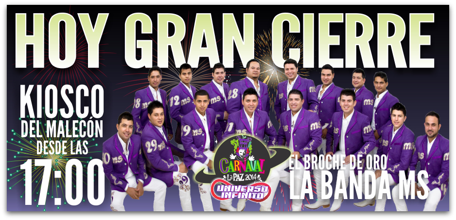 Los paceños esperan el gran cierre con broche de oro del Carnaval La Paz 2014 con la presentación estelar de la Banda MS. Juventud, versatilidad, explosividad y talento son las palabras con las podemos definir a la Banda MS. En sus presentaciones los chicos de esta agrupación son increíbles, ya que ponen al público entero a corear todas sus canciones, a bailar a su incomparable ritmo, y porque no, también a llorar con sus letras tan románticas, destacó Aguilar Bazúa.